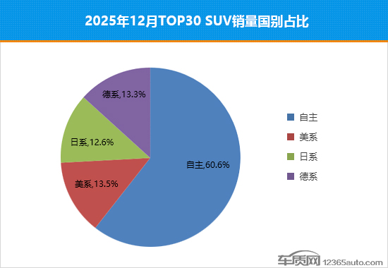 本月除自主品牌外,美系、日系和德系品牌销量占比都有不同程度增长,表现最突出的是美系品牌,占比跃升至两位数,较11月提高了4.4个百分点。同期,韩系、法系及欧系品牌仍然表现低迷,本月无任何车型进入榜单。