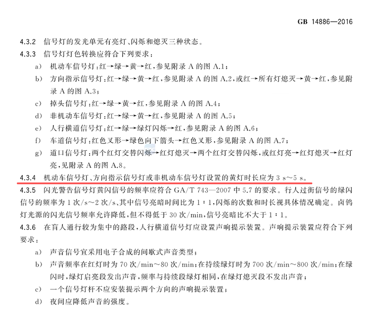 误区3:“黄灯缩短到2秒”?错!国标明确规定,“机动车信号灯、方向指示信号灯或非机动车信号灯设置的黄灯时长应为3s-5s。”