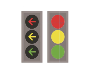 新国标红绿灯采用"中圆盘+左右箭头"的标准化组合形式,主要有两种排列方式:
