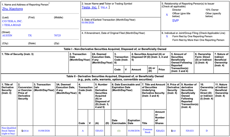 当地时间1月12日,特斯拉向美国证券交易委员会(SEC)提交的一份文件披露,公司高级副总裁朱晓彤获得520,021股股票期权,行权价为每股435.8美元,至2031年3月5日才能完全归属,到期日为2036年1月8日。