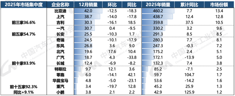 销量梯队分层明显。除两家400万辆级企业外,吉利汽车、中国一汽跻身300万辆梯队,中国长安、奇瑞汽车、东风汽车则处于200万辆规模区间,整体格局相对稳定。