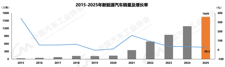 回看2025年,行业仍处于高增长收尾期:全年产量3453.1万辆、销量3440万辆,同比分别增长10.4%和9.4%,连续17年蝉联全球第一,且销量超年初预期。