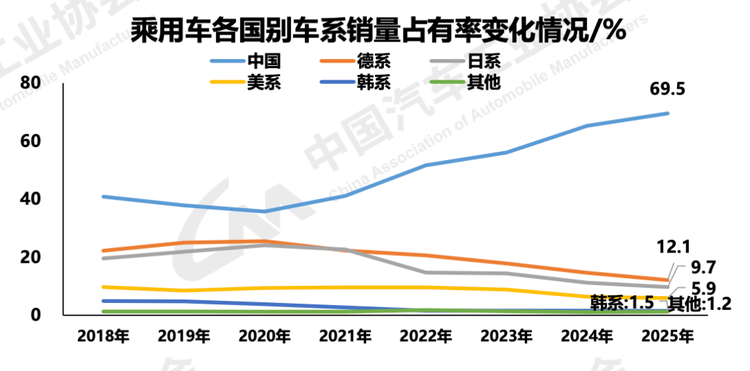 相比之下,合资品牌市场份额进一步萎缩至30%,德系、日系、美系、韩系分别占12.1%、9.7%、5.9%、1.5%。外资品牌的传统优势持续消解。