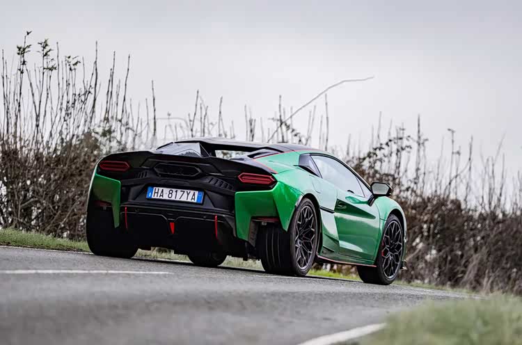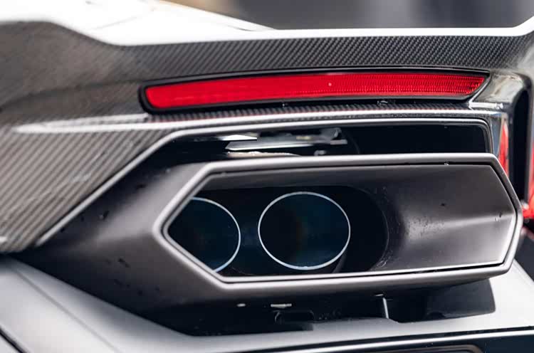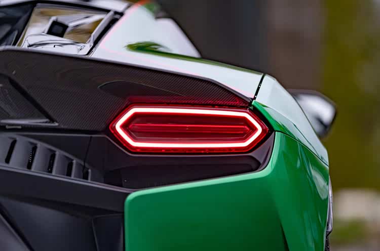 车身侧面,标志性的小牛线条得到延续,低趴并不算修长,与大牛车型进行了明显的区分,夸张的进气道,复杂的腰线,大尺寸的轮毂,贯穿的红色装饰等元素不会缺席,保证了应有的战斗感。车尾部分,尾灯有着和前方大灯组相似的六边形造型,也是整车的主要设计元素,中置双出排气被六边形边框包裹,夸张的散热机构,复杂的扩散器和导流槽等元素当然都不会缺席,显示了超跑应有的姿态。