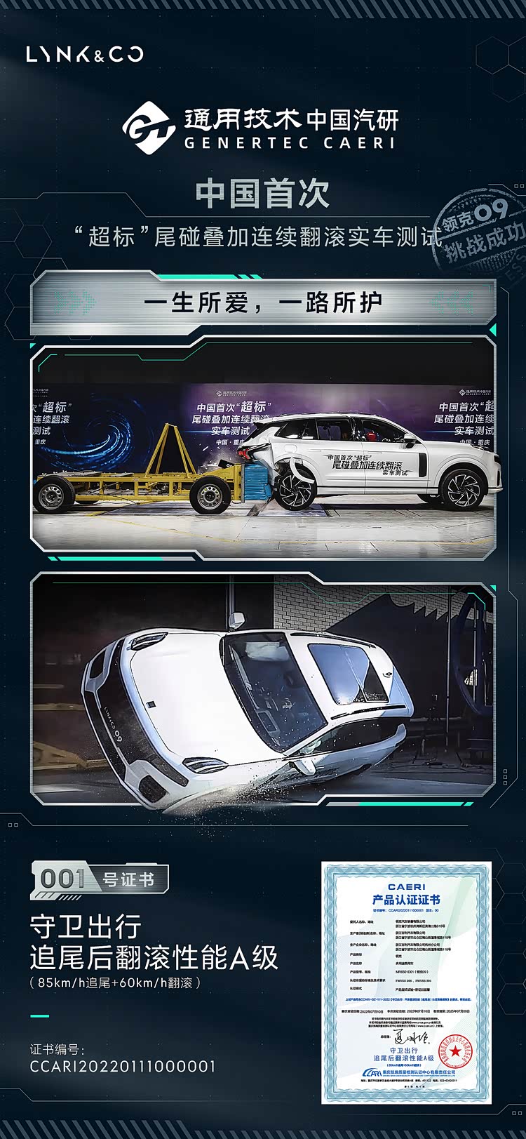 权威测试也印证了它的实力:中国首次“超标”尾碰叠加连续翻滚实车测试,85km/h追尾+60km/h连续翻滚,领克09顺利通过,并获得“追尾后翻滚性能A级”001号认证,技术表现稳得像护身符。