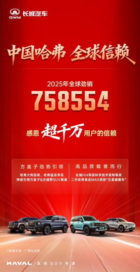 2025年,哈弗品牌在竞争激烈的汽车市场中,交出了一份扎实的成绩单:2025年全球劲销758554辆,同比增长7.41%。更值得关注的是,其全球累计用户在2025年正式突破1000万大关。