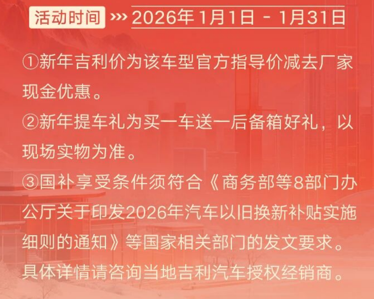 根据官方的宣传,此次活动可享受至高20000元厂家置换补贴,其中享受现金补贴的车型优惠至高达到了1.8万(星越L、缤瑞COOL),用户提车还可享受“买一车送【一车】好礼”活动,即为“送一后备厢旺旺大礼包”,优惠活动时间为2026年1月1日至2026年1月31日。