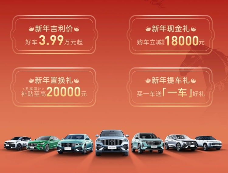 为全力冲刺2026年“开门红”,吉利汽车于近日正式启动开年钜惠行动,多款热门车型迎来官降,最便宜的车型起售价低至3.99万。其中,国民家轿 帝豪(参数|询价)与小型SUV缤越的起售价分别低至4.89万元和5.98万元,性价比优势显著,下面来看看具体的优惠详情: