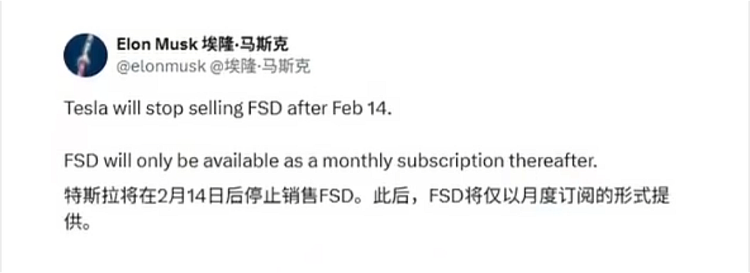 将在2月14日后停止销售FSD(完全自动驾驶系统),此后,FSD将以阅读订阅的方式提供。