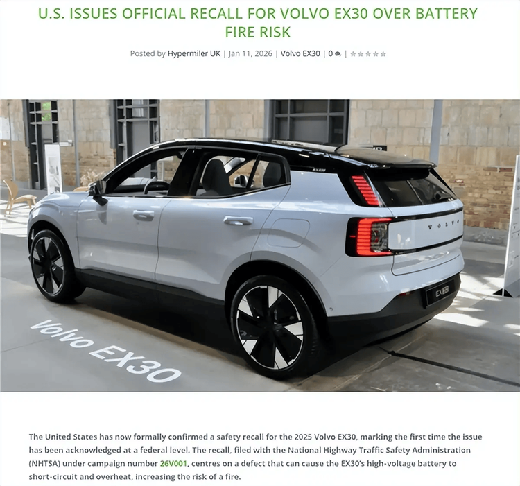 猫头鹰车志(ID:owlauto)讯,近日,据媒体报道,沃尔沃汽车因所搭载的欣旺达电池存在起火风险,已在美国、加拿大、英国、南非等多个国家和地区宣布召回 沃尔沃EX30(参数|询价)车型。