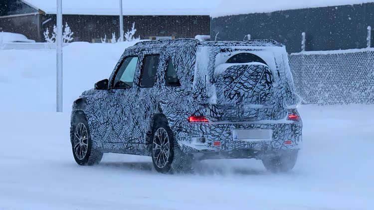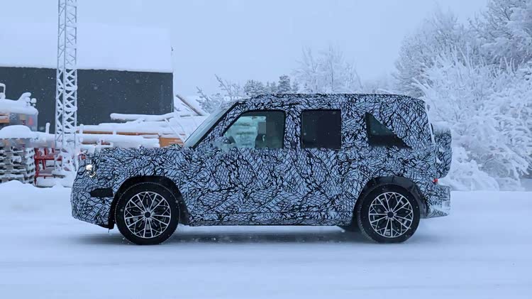 外观上来看,这款迷你版G级沿袭了大G的方正设计风格,虽然它披着厚厚的全车伪装,但整体的比例依然非常清晰,前脸采用圆润的车头造型,两侧配备了标志性的圆形大灯。具体来看,这台小G的车身轮廓棱角分明,依然是非常硬朗的视觉姿态,发动机盖与车顶基本保持了平直,轮眉的宽体设计则为方正的车身线条增添了一丝的变化,另外,该车配备了不对称的雪花状轮毂,看起来也很有识别度。