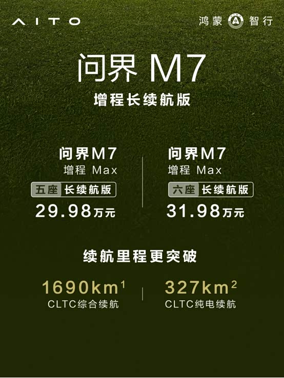 而就在里程碑达成同日,全新问界M7增程长续航版正式上市,推出五座与六座两个版本,售价分别为29.98万元和31.98万元,并同步启动大定,购车用户可享至高60000元权益。