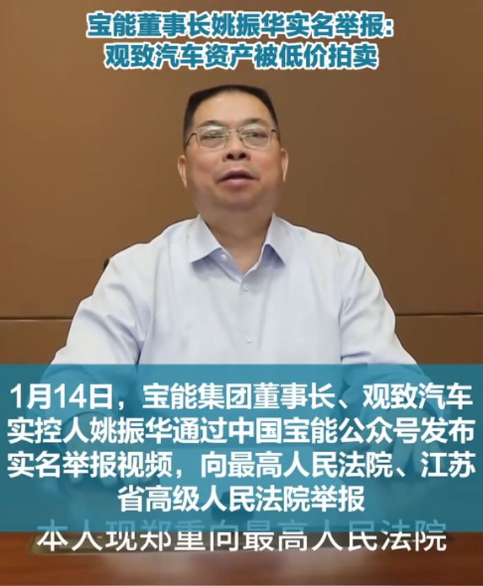 2026年1月14日,宝能集团董事长、观致汽车实控人姚振华通过官方账号发布实名举报视频。其向最高人民法院、江苏省高级人民法院举报,称观致汽车2.7亿元执行案件中存在违法操作,导致企业资产被低价拍卖。