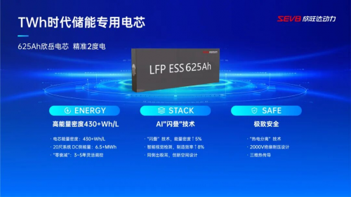 625Ah大电芯单体能量密度达430Wh/L,空间利用率提升30%,通过优化涂布辊压工艺、正负极浆料配方及注液浸润流程,成功解决高能量密度电芯的极片浸润难题。