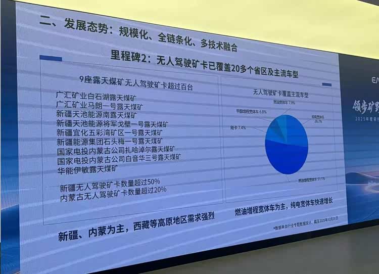“在政策、技术和模式三轮驱动下,2025年成为矿山无人驾驶的规模化应用元年”。据中国煤炭工业协会信息化分会秘书长王丹识介绍。“截至2025年底,全国在运行无人驾驶矿卡突破4000台。”