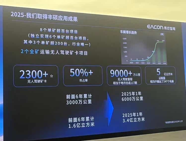 从2023年的接近300台,到2024年突破千台,再到2025年翻倍至两千台以上,易控智驾实现了矿山无人驾驶技术的规模化跨越。