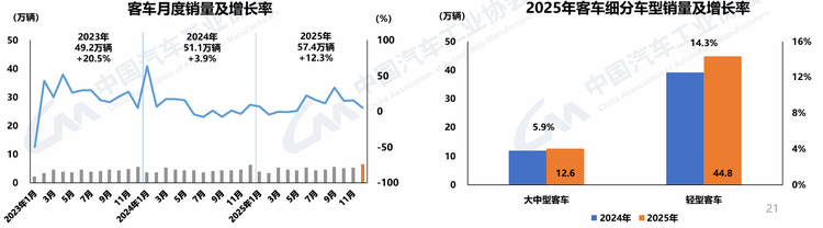2025年全年,客车产销分别完成56.8万辆和57.4万辆,同比分别增长11.8%和12.3%。其中,大中型客车销量12.6万辆,同比增长5.9%;轻型客车销量44.8万辆,同比增长14.3%