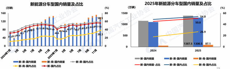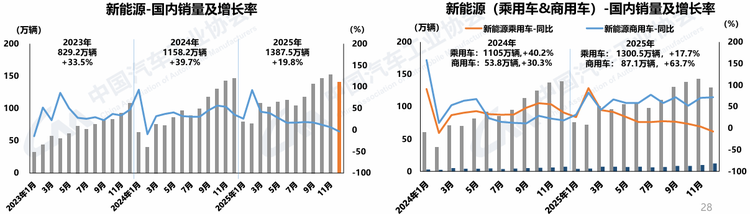 2025年12月,新能源商用车国内销量12万辆,环比增长23.2%,同比增长72%,新能源商用车国内销量占商用车国内销量比例为38.3%;2025年全年,新能源商用车国内销量87.1万辆,同比增长63.7%,新能源商用车国内销量占商用车国内销量比例为26.9%。