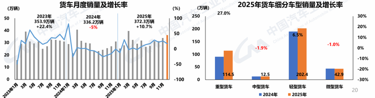 2025年全年,货车产销分别完成369.3万辆和372.3万辆,同比分别增长12%和10.7%。其中,重型货车销量114.5万辆,同比增长27%;中型货车销量12.5万辆,同比下降1.9%;轻型货车销量202.4万辆,同比增长6.5%;微型货车销量42.9万辆,同比下降1%。