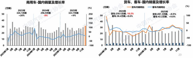 2025年全年,商用车国内销量323.7万辆,同比增长9%。其中,货车国内销量281.5万辆,同比增长8.9%;客车国内销量42.2万辆,同比增长9.8%。