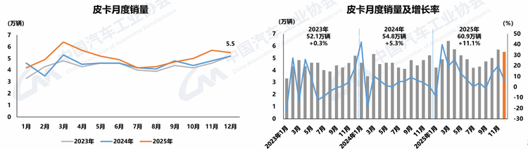 2025年,皮卡产销分别完成59.1万辆和60.9万辆,同比分别增长12.6%和11.1%。分燃料类型看,汽油车产销分别完成14.6万辆和15.4万辆,同比分别下降3.3%和2.1%;柴油车产销分别完成36.7万辆和37.9万辆,同比分别增长6.4%和4.5%。