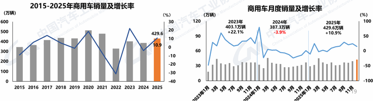 2025年全年,商用车产销分别完成426.1万辆和429.6万辆,同比分别增长12%和10.9%。其中,天然气商用车销量24.6万辆,同比增长11.6%。在商用车主要品种中,与2024年相比,客车和货车产销均呈实现10%以上增长。