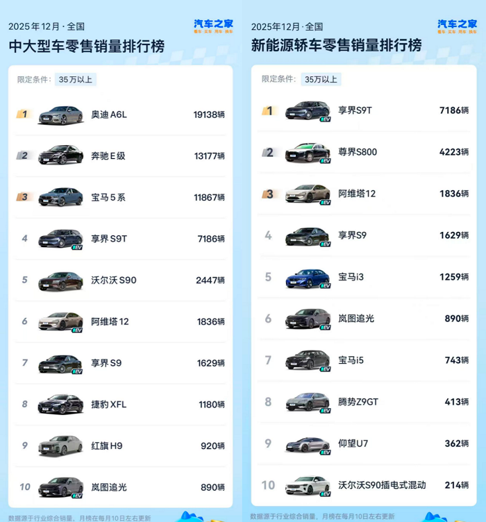 在传统认知中,豪华汽车市场长期由奔驰、宝马、奥迪(BBA)三足鼎立。然而,2025年末的一组数据悄然改写了这一格局:中国品牌享界12月销量突破8800台,享界S9T连续3月在35万元以上中大型车销量榜单稳居第四,与BBA正面交锋。据悉,享界品牌用户中超过60%来自BBA等传统豪华品牌用户增换购,新款享界S9车型甚至有70%源自BBA车主“跳槽”。这不仅是一次销量的胜利,更是豪华定义权的转移。