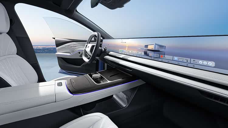 进入车内,设计重心完全转向科技感与沉浸感的营造。宽度达1.13米的45英寸8K一体式屏幕几乎横贯整个中控台,构成了绝对的视觉焦点。这块屏幕并非简单拼接,而是采用了先进的贴合工艺,实现了近乎无边框的一体化效果,犹如悬浮于饰板之上。内饰材质搭配讲究,大量软性包裹、金属装饰件以及可调氛围灯系统,共同构筑了一个兼具温度与科技感的驾驶空间。