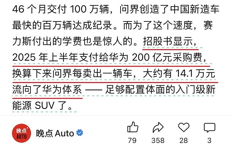 可能大家对这个数字没有概念,咱们细化一下,按照2025上半年支付给华为200亿元计算,赛力斯每卖出一辆问界,就要支付给华为大约14.1万元。