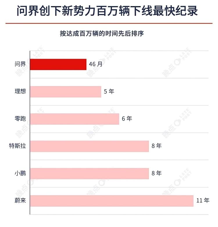 数据显示,在华为的助力下,问界只用了46个月,就达成百万辆新车下线目标。而同样完成百万新车下线目标,理想用了5年,零跑用了6年,特斯拉用了整整8年。