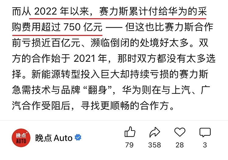 内容显示,自2022年赛力斯与华为深度合作以来,赛力斯累计给华为支付了750亿元的采购费用。