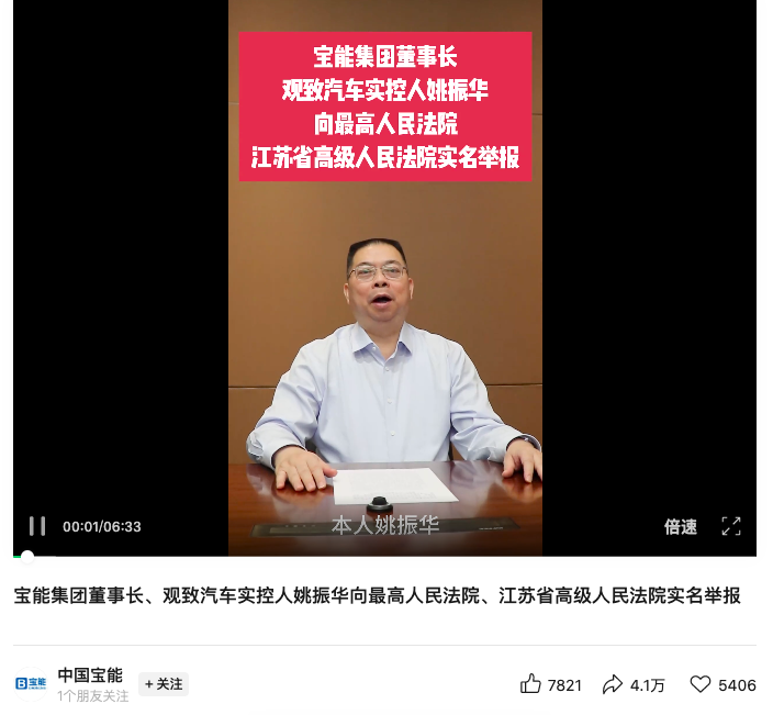 先把事件来龙去脉说清楚。1月14日,距离观致汽车常熟生产基地二次拍卖不足24小时,姚振华通过“中国宝能”公众号发布6分33秒实名举报视频,矛头直指常熟市委常委、经开区管委会及常熟市人民法院,举报对象是观致汽车2.7亿元执行案件中的系列操作。