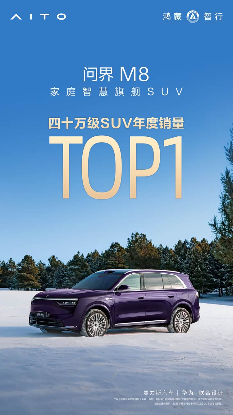 问界M8成2025年四十万级SUV销量第一,起售价35.98万元