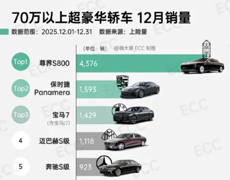 2025年12月,70万以上超豪华轿车当月销量排行榜中,尊界S800出乎所有人意料地登顶了Top1。并且更令人吃惊的是,当月平均每卖出1台迈巴赫同时就会卖出将近4台尊界S800。而与此同时,尊界S800的4376辆月销量已经超过了帕拉梅拉+宝马7系+迈巴赫S级的总和。
