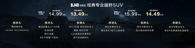 如此布局,核心目标就是走量。硬派越野市场虽在增长,但13-15万价位存在明显空白:合资车型定价偏高,新能源越野有溢价,竞品多为承载式车身的“伪硬派”。BJ40探险家以亲民价入市,叠加六重购车礼,将后桥差速锁、AT胎等专业配置纳入标配,比同价位竞品更具性价比,既能吸引越野新手,也能打动预算有限的老玩家。