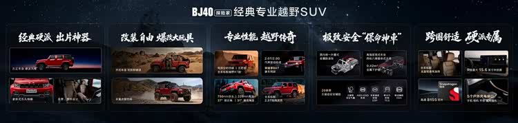 北京越野董事长王昊表示,BJ40作为中国越野的领路者,亲历过无数盛事荣耀,也成为中国汽车的独特文化符号,在全球用户的认可中走入了万千家庭。BJ40以探险家的名义,开启全新征程,在经典设计、自由改装、专业性能、极致安全和跨圈舒适五大维度再造新经典,为中国越野车市场再造经典专业越野SUV。