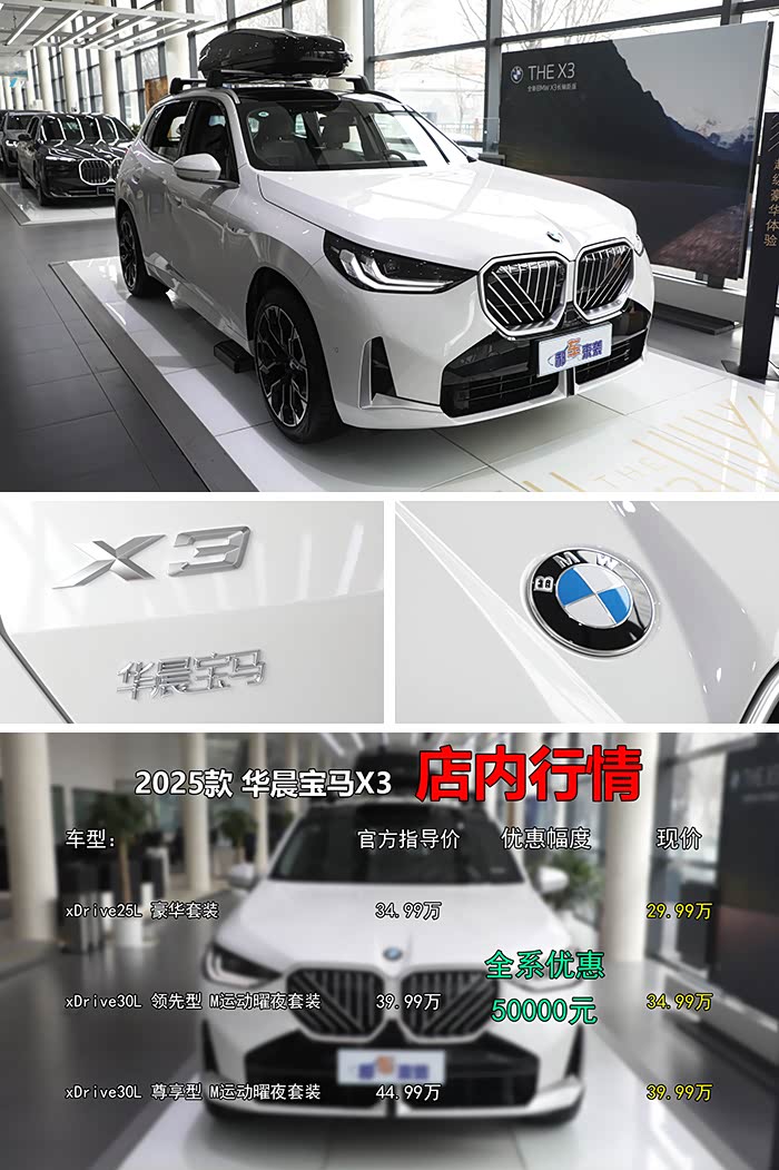《郝车来袭》原创导购:近日,根据郝哥探访北京地区某宝马4S店得知,目前2025款 华晨宝马X3(参数|询价)共在售三款车型,并且新车全系优惠50000元左右,换句话说,优惠后售价区间仅为29.99万~39.99万元,那么该选择哪款配置的性价比才最高?推荐配置落地价得多少钱?养车成本又如何呢?