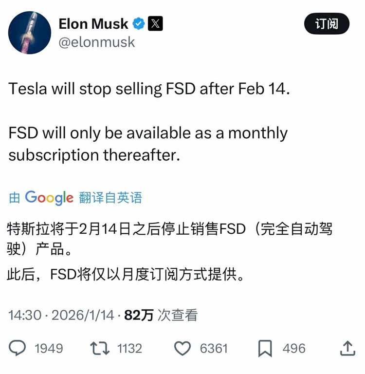 车家号·0浏览·2026-01-15 23:58 · 广东近日,我们从海外社交媒体获悉,马斯克宣布,将于今年 2 月 14 日后,停售 FSD 买断方案;后续将会采用月度订阅的方式提供。