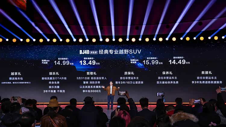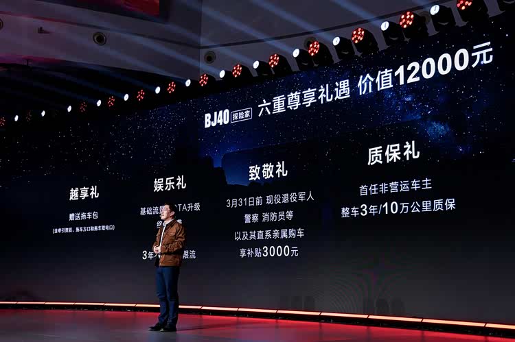发布会现场,北京越野还公布了多重购车礼遇,包括赠送拖车包(含牵引资质、拖车方口和拖车取电口);基础流量及OTA升级终身免费,娱乐流量3年不限量、不限流;首任非营运车主,整车3年/10万公里质保、首次基础保养免费、享3年免费道路救援服务等。