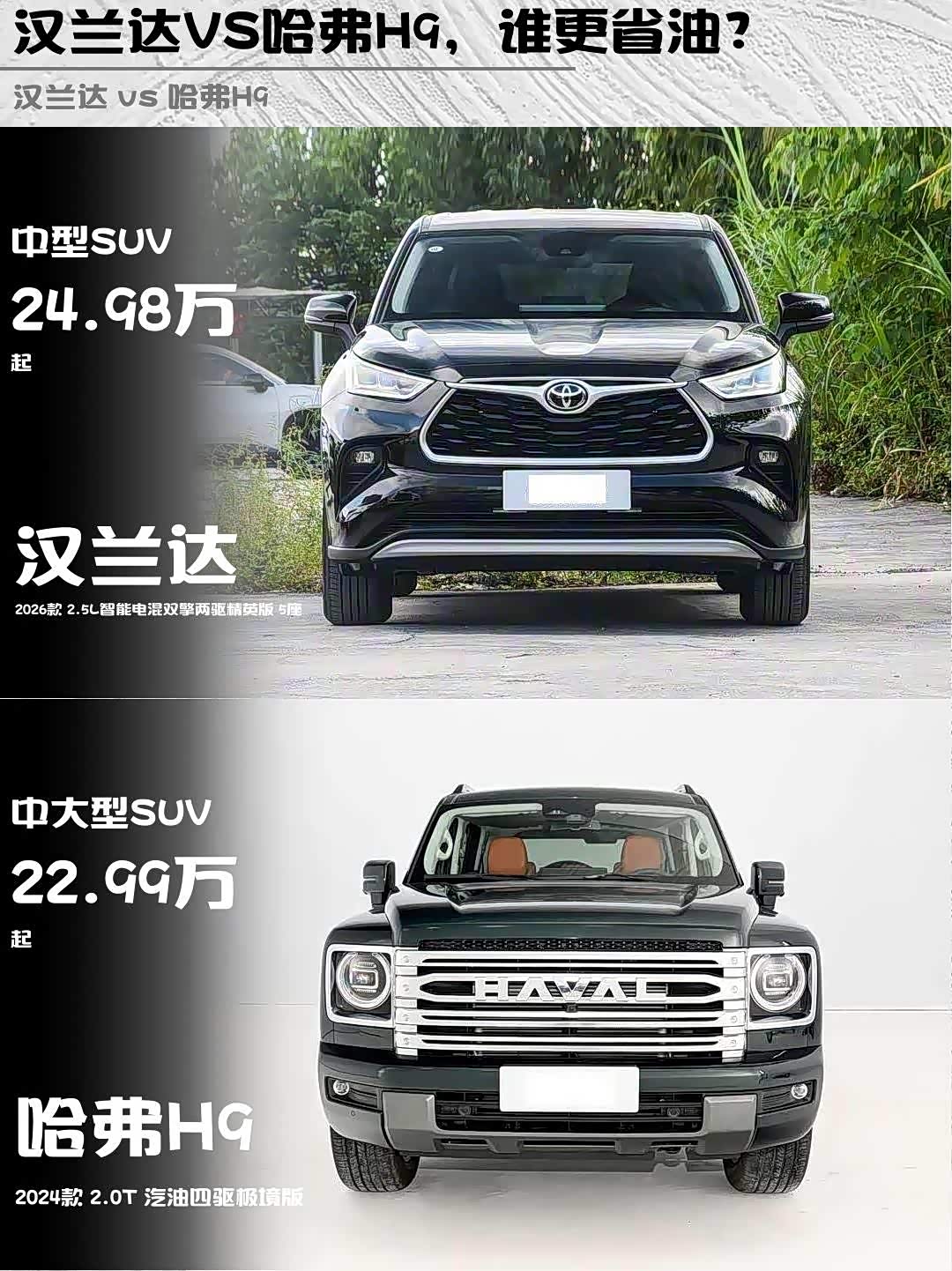 最近后台好多兄弟在问:25万预算选家用SUV,到底是汉兰达2026款2.5L智能电混双擎两驱精英版5座,还是 哈弗H9(参数|询价) 2024款2.0T汽油四驱极境版?作为两台车都深度试驾过的老司机,今天直接上硬核对比!🔥
