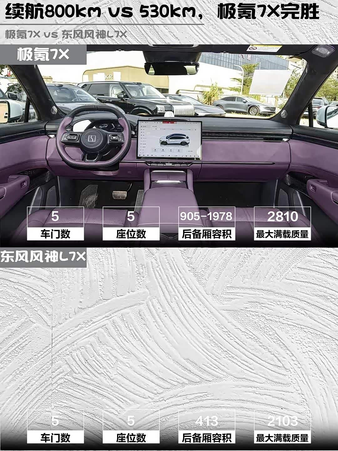 极氪7X贵3万多但配置碾压:360影像、电动尾门、座椅加热/通风全配齐。东风风神L7X更像毛坯房,但21.76万的价格对预算党友好。建议等等促销,听说老款极氪7X有2万清仓优惠💰