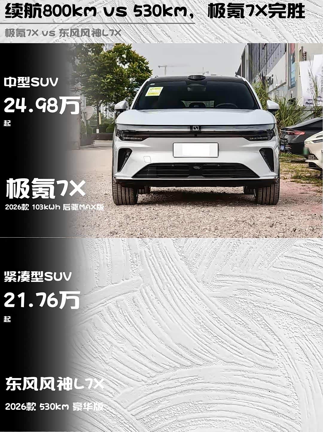 最近在选纯电SUV的朋友看过来!今天深度对比两款热门车型——极氪7X 2026款 103kWh 后驱MAX版 vs 东风风神L7X(参数|询价) 2026款 530km 豪华版,实测干货直接上菜🔥