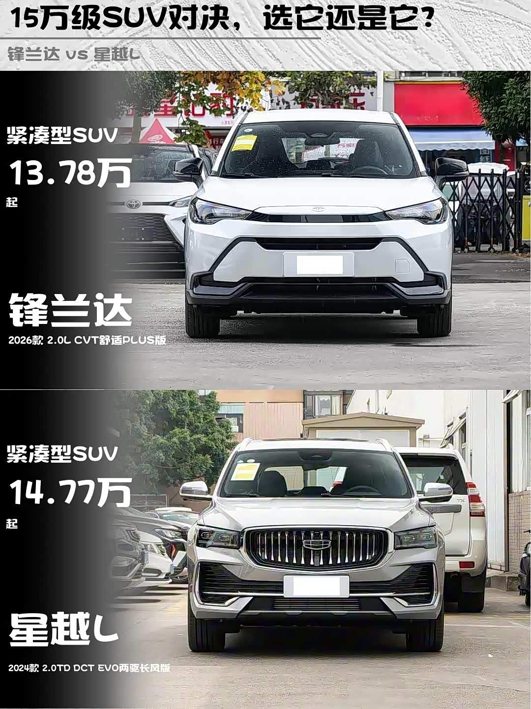 车家号·0浏览·2026-01-16 08:25 · 北京最近后台好多人在问15万级SUV怎么选,今天拉出两台热门选手——2026款 锋兰达(参数|询价)2.0L CVT舒适PLUS版(13.78万)和2024款星越L 2.0TD两驱长风版(14.77万),实测对比干货直接上!🔥
