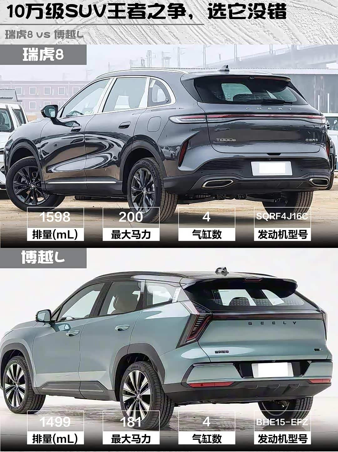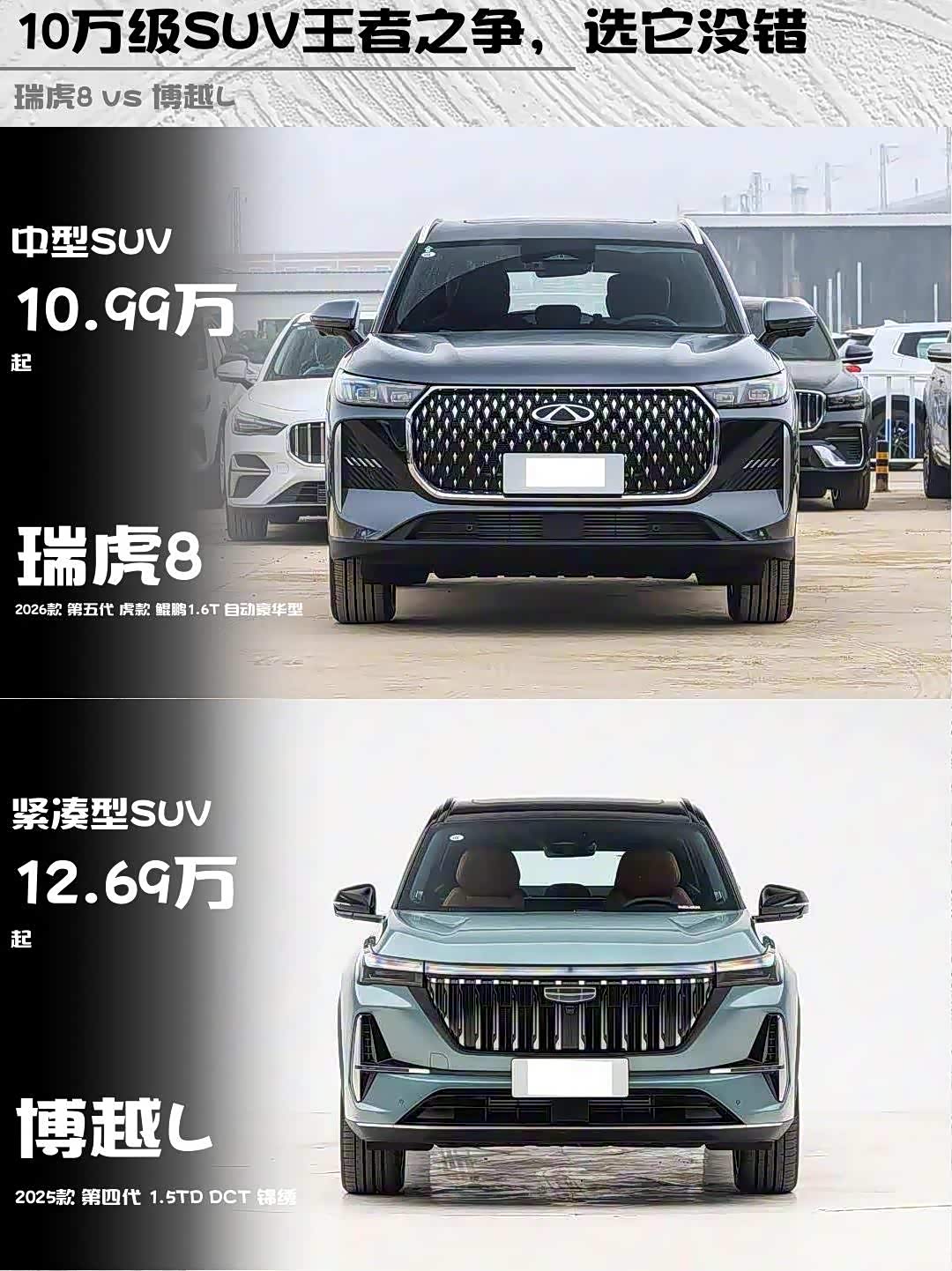 车家号·0浏览·2026-01-16 08:31 · 北京最近在选15万级SUV的朋友看过来!🔥 刚深度试驾完2026款 瑞虎8(参数|询价) 鲲鹏1.6T自动豪华型和2025款博越L 1.5TD锦绣版,这两台国产热门车差距比想象中还大...(附真实体验干货)