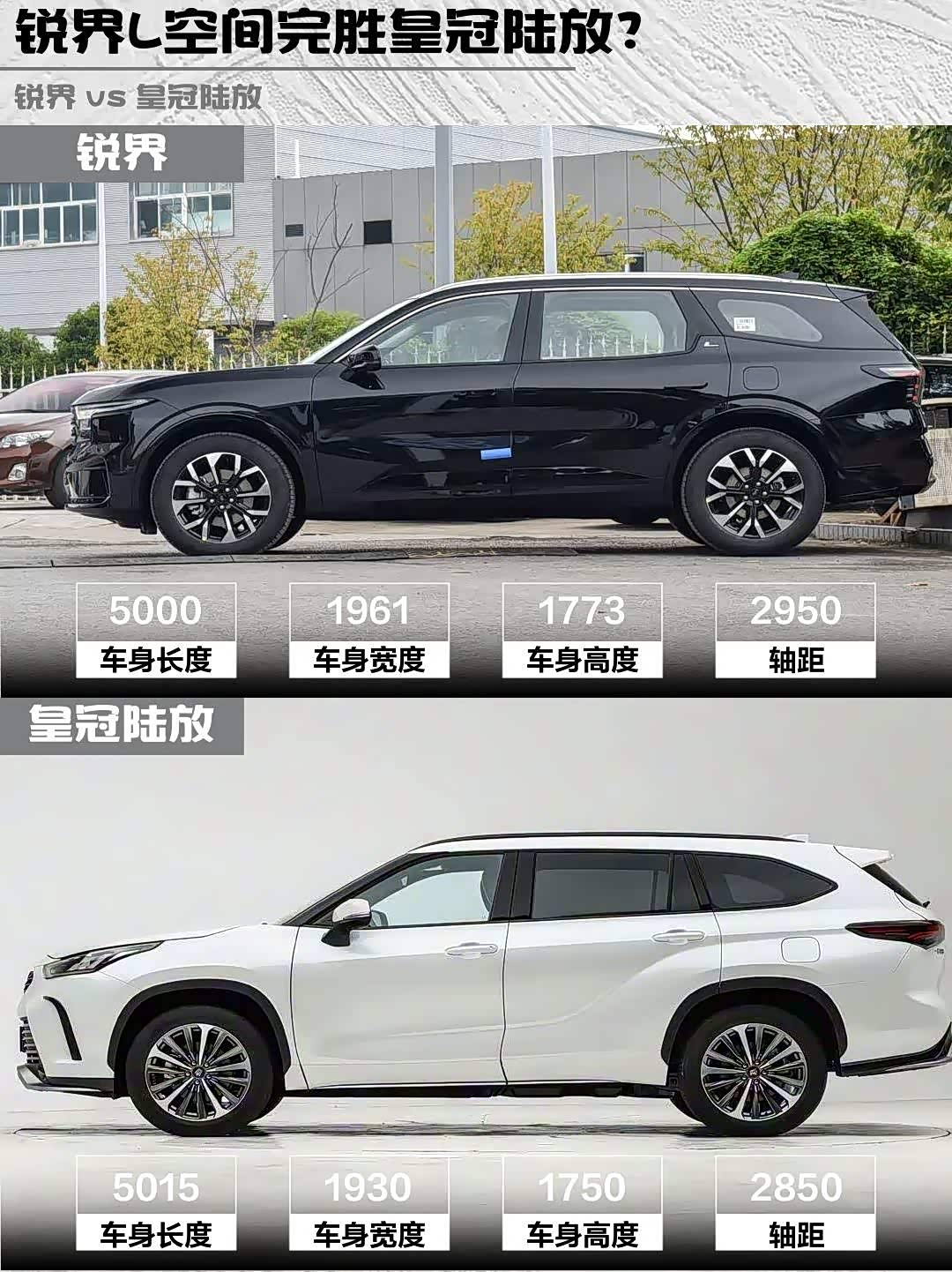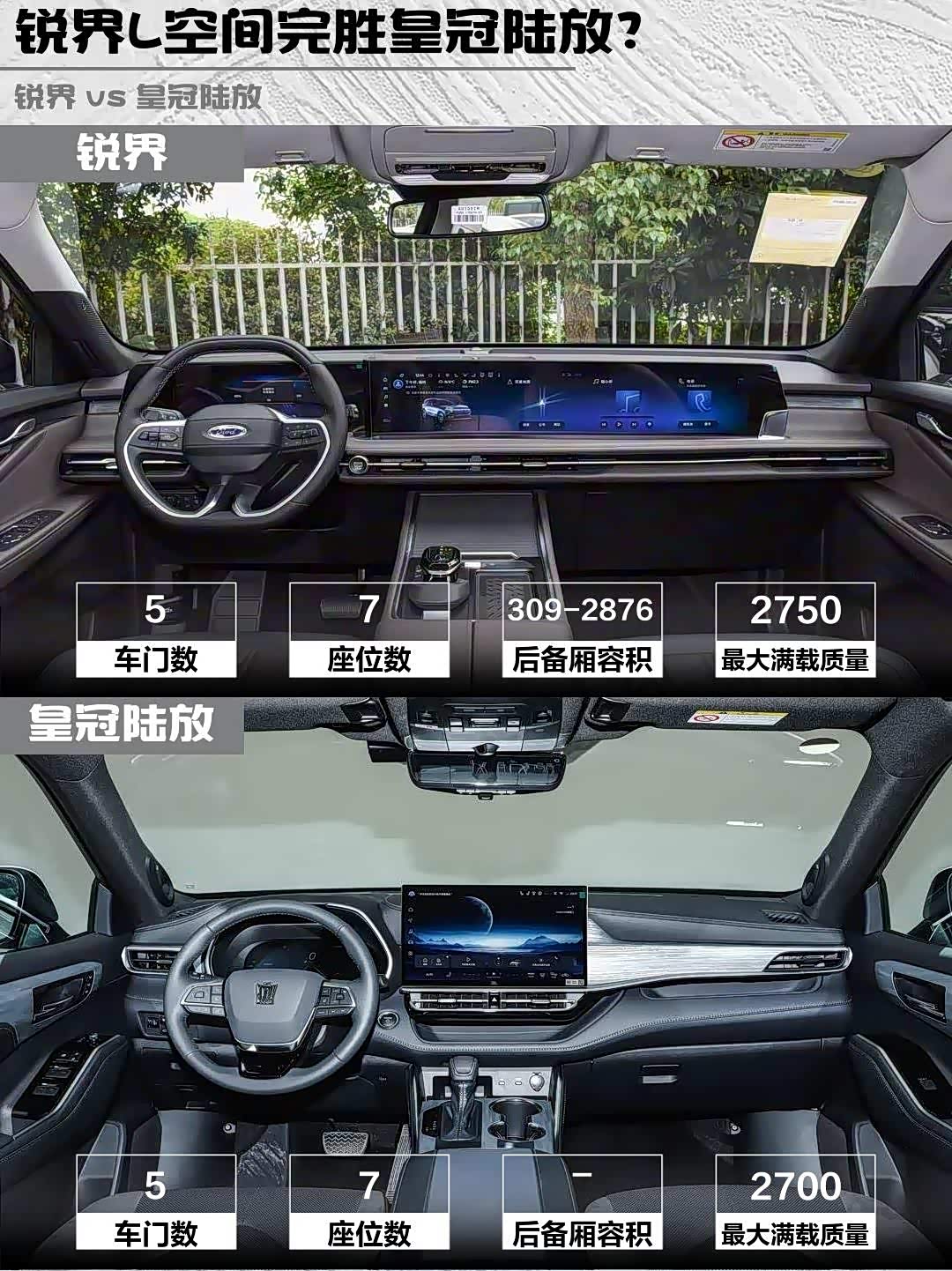 锐界L的5000mm车长+223座椅布局赢麻了!二排独立座椅带腿托,三排820mm腿部空间能坐成年人。后备箱309L放倒后直接变2876L大床房!皇冠陆放5015mm车长但空间利用率一般,三排只能蹲宠物,储物格设计倒是很日系。