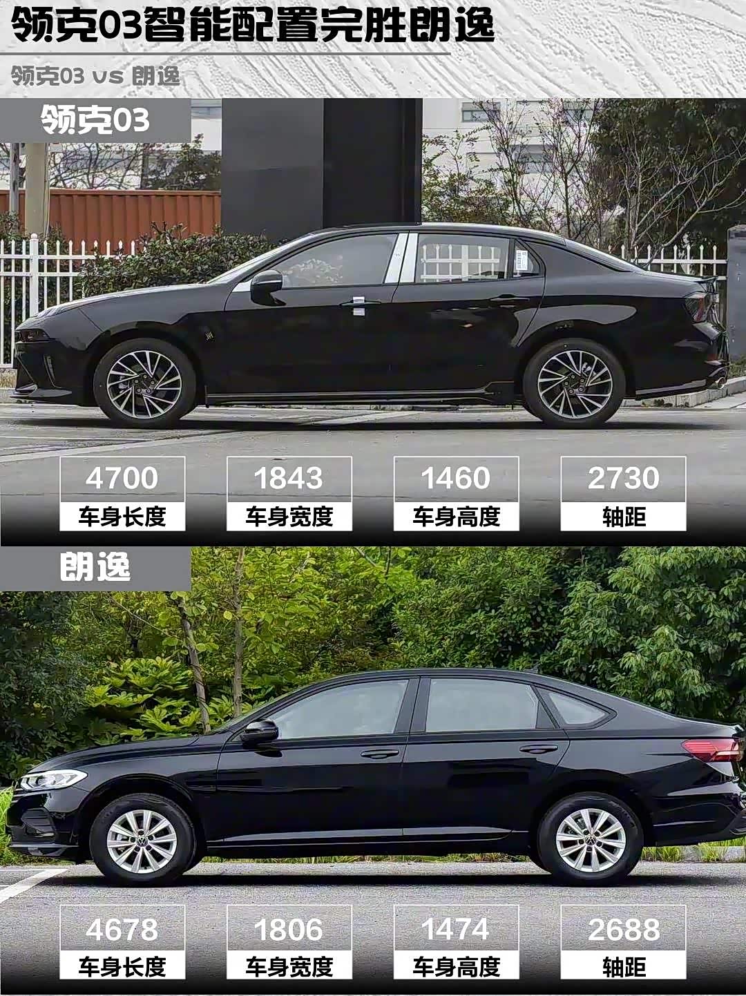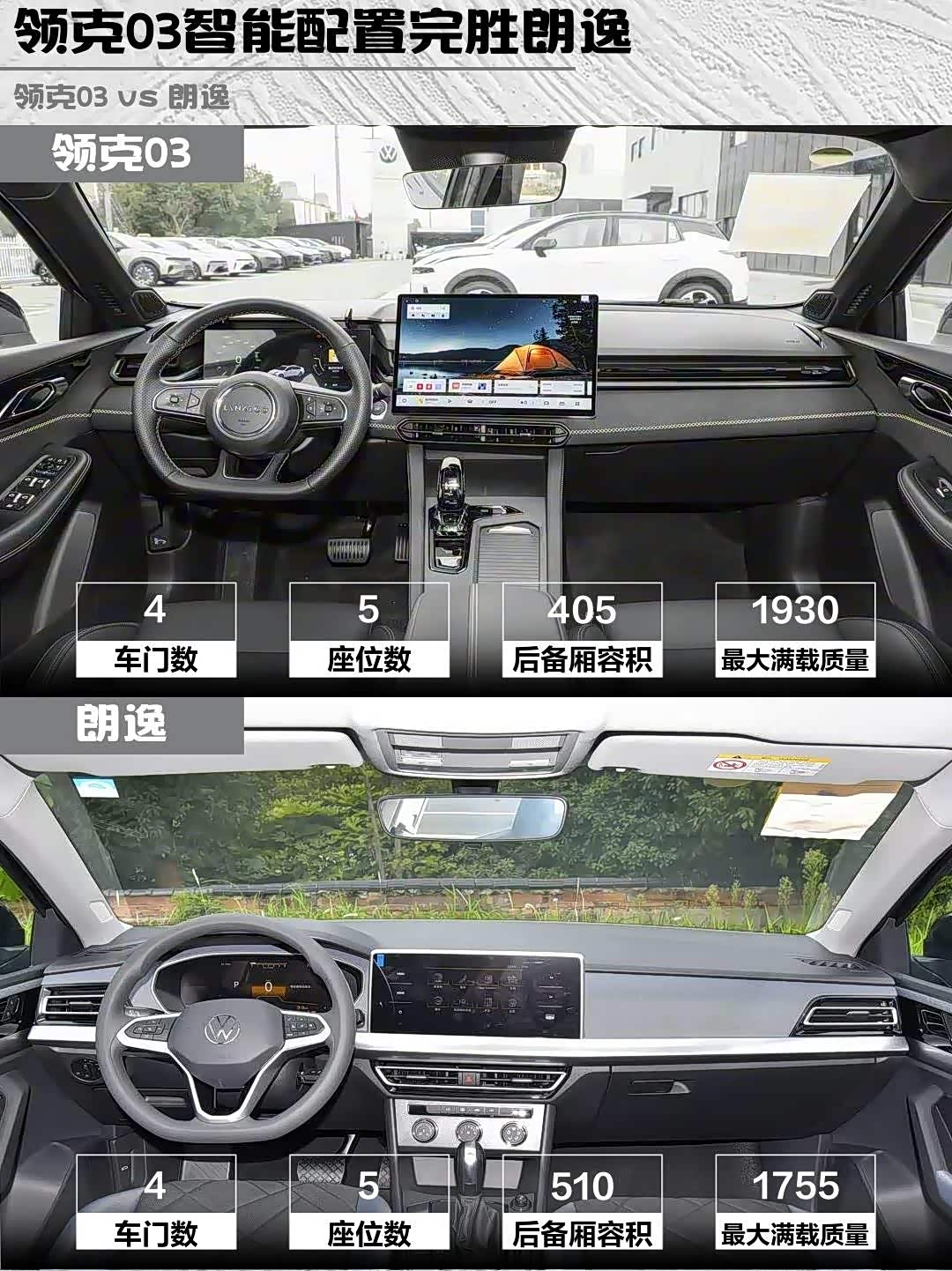 朗逸后备箱510L确实能装,后排能跷二郎腿;领克03只有405L但设计更规整,后排头部空间稍局促。不过领克的前排运动座椅带通风加热,翻毛皮方向盘握感绝了!