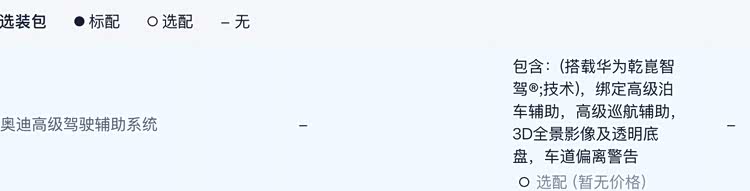 最后令人意外的是,奥迪高级驾驶辅助系统(搭载华为乾崑智驾®技术的高级泊车辅助、高级巡航辅助、3D全景影像及透明底盘、车道偏离警告)看起来全系都可以加装,但在下定的配置单上并未呈现,也没有显示加装价格,相当于目前订购的话是无法选装的。