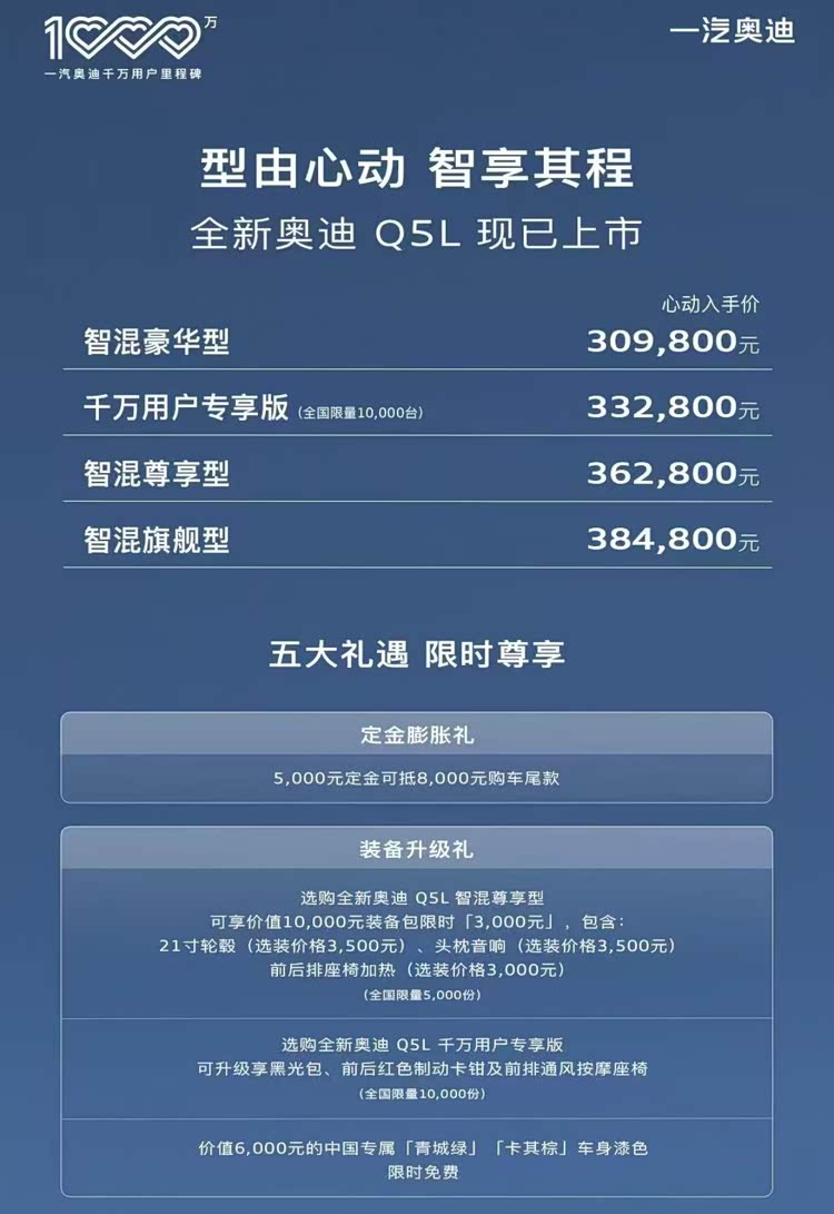 1、 正式价格要低于此前发布的预售价,比如预售价是31.3万元起,正式发售价为30.98万元起,要注意这是官方建议价,相比此前Q5L车系,官方建议价是34.98万元起步,换代新车还是体现出了充分的诚意。