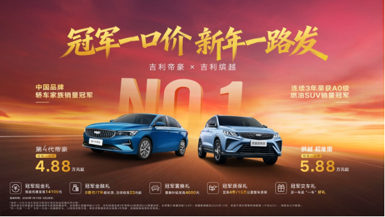 2026吉利中国年,好事连连驫新年!吉利汽车再爆王炸优惠,价格直降到底,错过再等一年!1月15日至2月28日,吉利中国星“双冠车型”吉利帝豪与吉利缤越联手推出“冠军一口价”新年限时活动,第4代帝豪4.88万元起,缤越超能版5.88万元起,以触手可及的价格助力更多用户新年开冠军好车,马上得“冠军”好运!