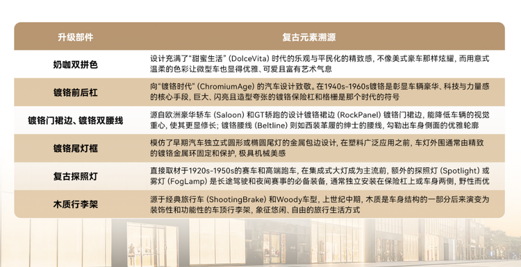 细节之处,尽显摩登巧思。复古探照灯的设计,让人联想到上世纪中期赛车与高端跑车的野性优雅;木质纹理的车顶行李架,则唤醒了经典旅行车所代表的自由、悠闲生活方式。镀铬门裙边与双腰线勾勒出修长侧影,镀铬尾灯框复刻了早期汽车的机械美感。甚至在内饰中,甜品造型的换挡旋钮、游戏手柄风格的功能按键,都于细微处注入趣味与甜心气质。